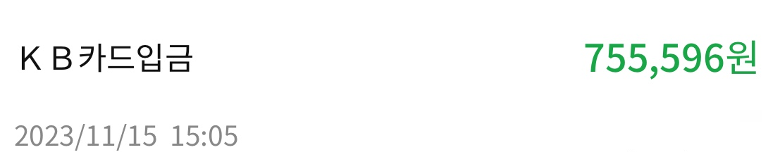 즐겁게 노동요를 부르고 있던 11월 15일 오후, 갑자기 뜬금없이 환불금이 카드사로부터 입금됐다. 만료됐다던 카드가 다시 부활이라도 했단 말인가! 아무튼 환불신청한 10월 15일로부터 정확히 1역월 후인 11월 15일에 환불금을 받을 수 있었다. 어차피 받을 돈 돌려받은건데 뜻밖의 횡재는 무엇이냐?